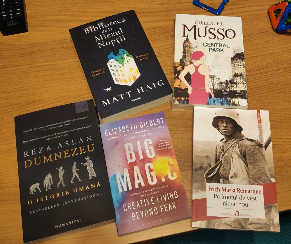 Două sunt pentru club, una o să mă ajute să citesc o carte mai veche de club care nu m-a prins, una e pentru că-mi place autorul și o să-l citim și la club, dar cu altă carte, iar Big Magic e pentru mine, ca să-mi vin in simțiri.